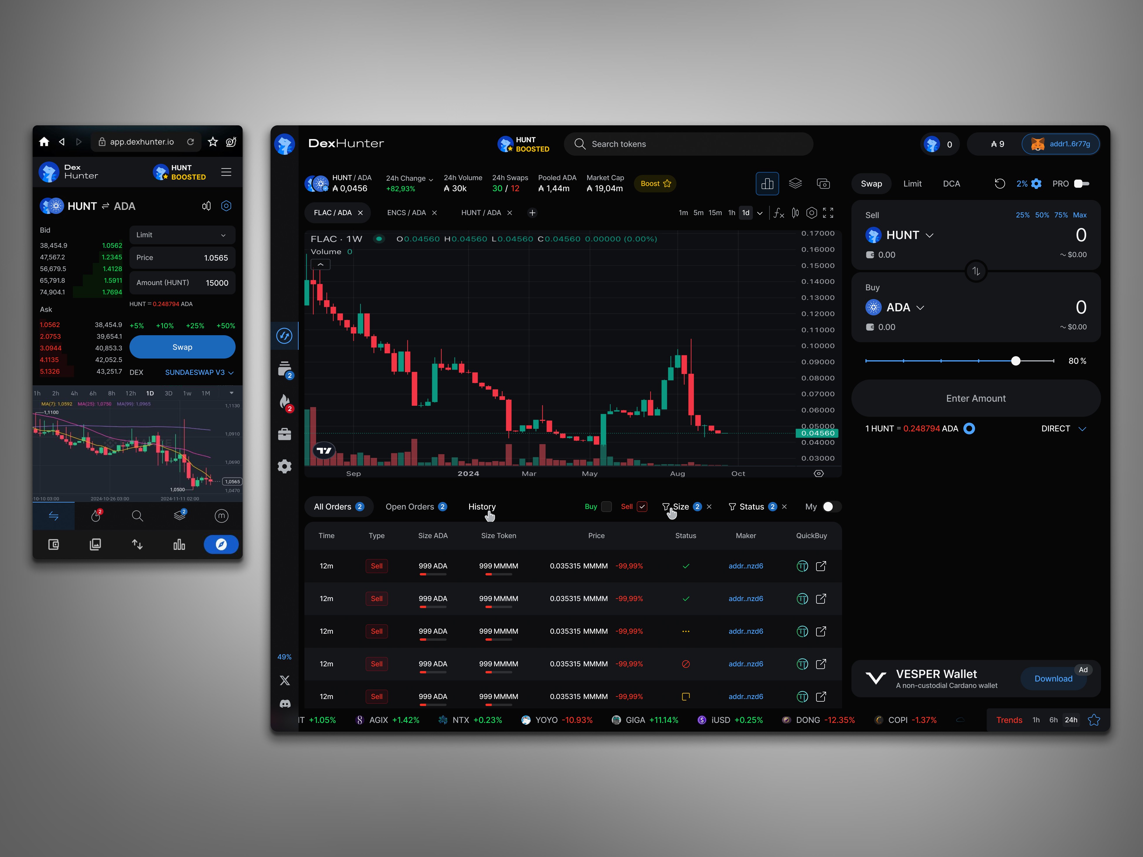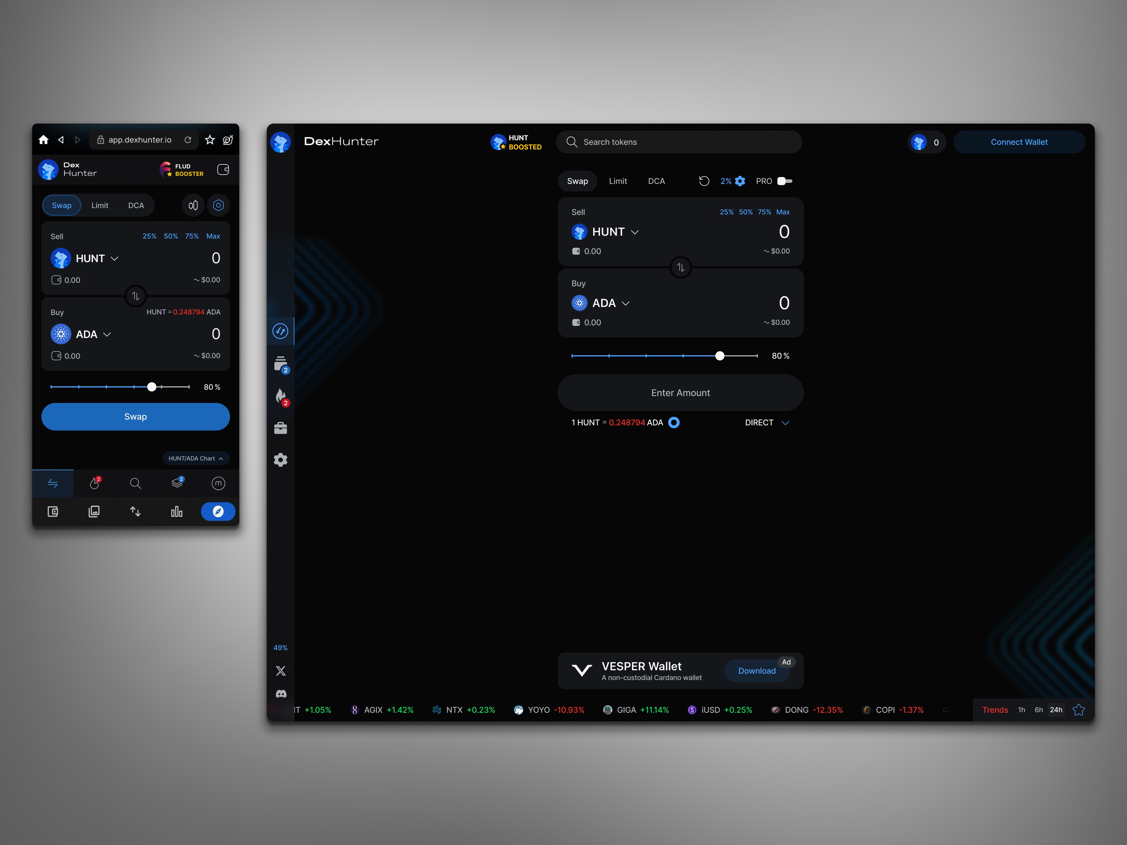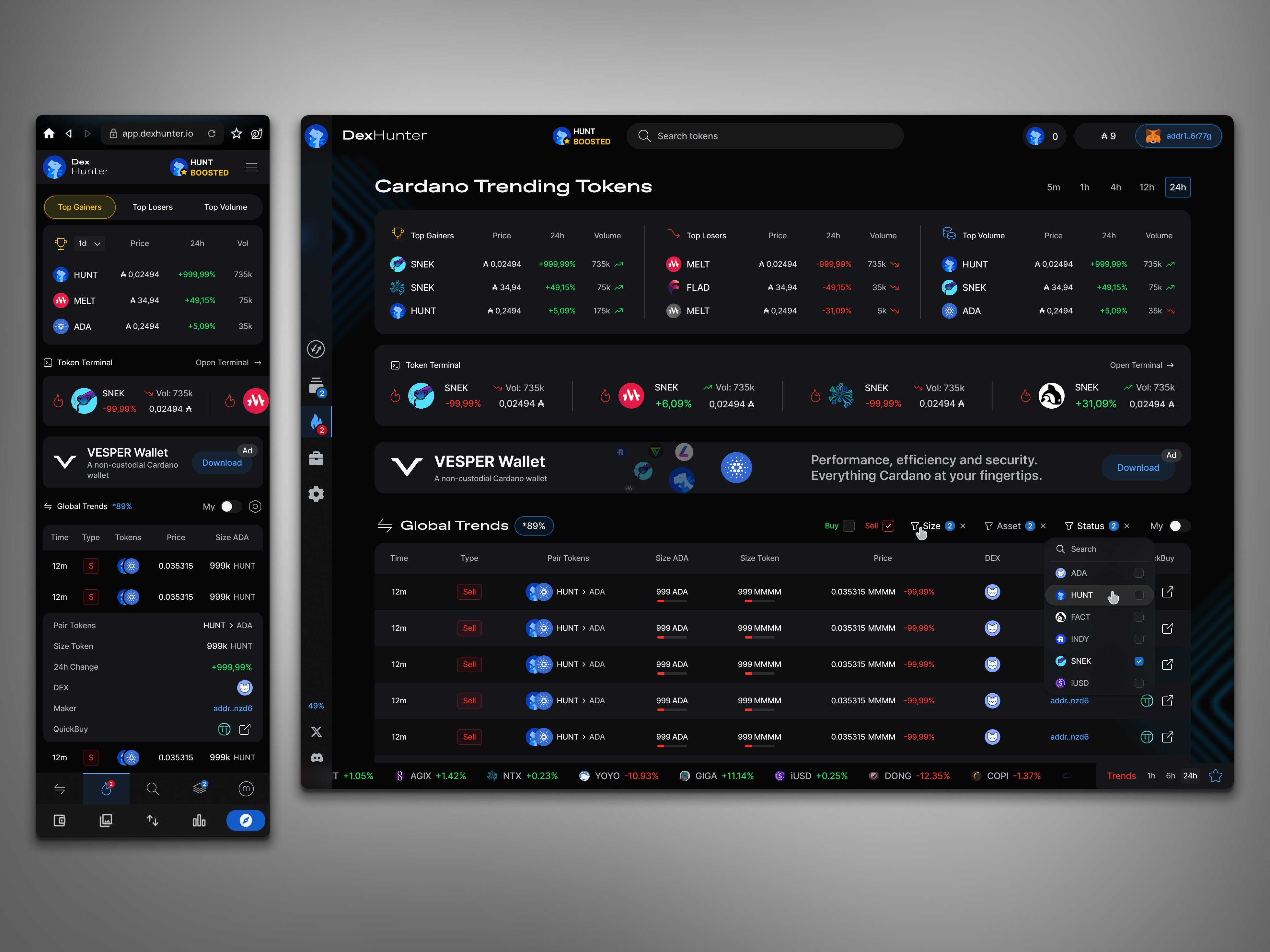 As the sole designer, I led the complete redesign of DexHunter - a Web3 trading aggregator built around real-time analytics and multi-exchange integration.