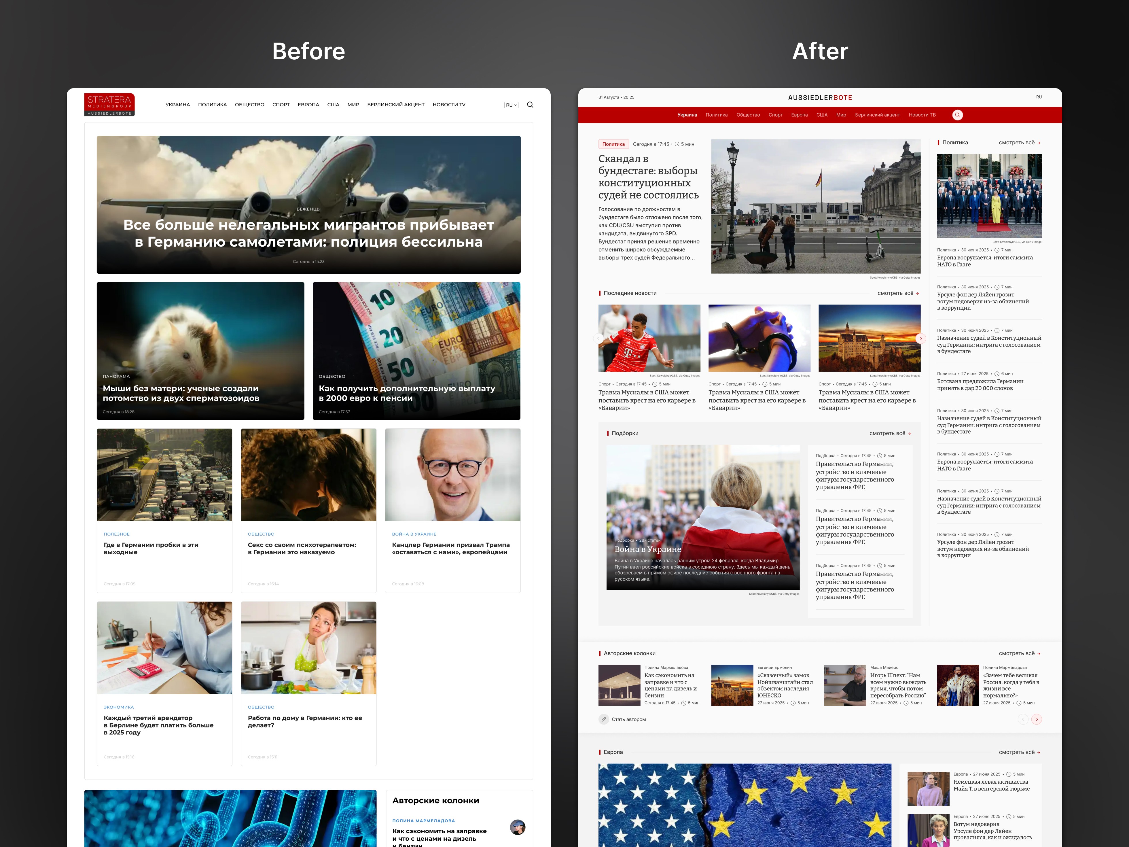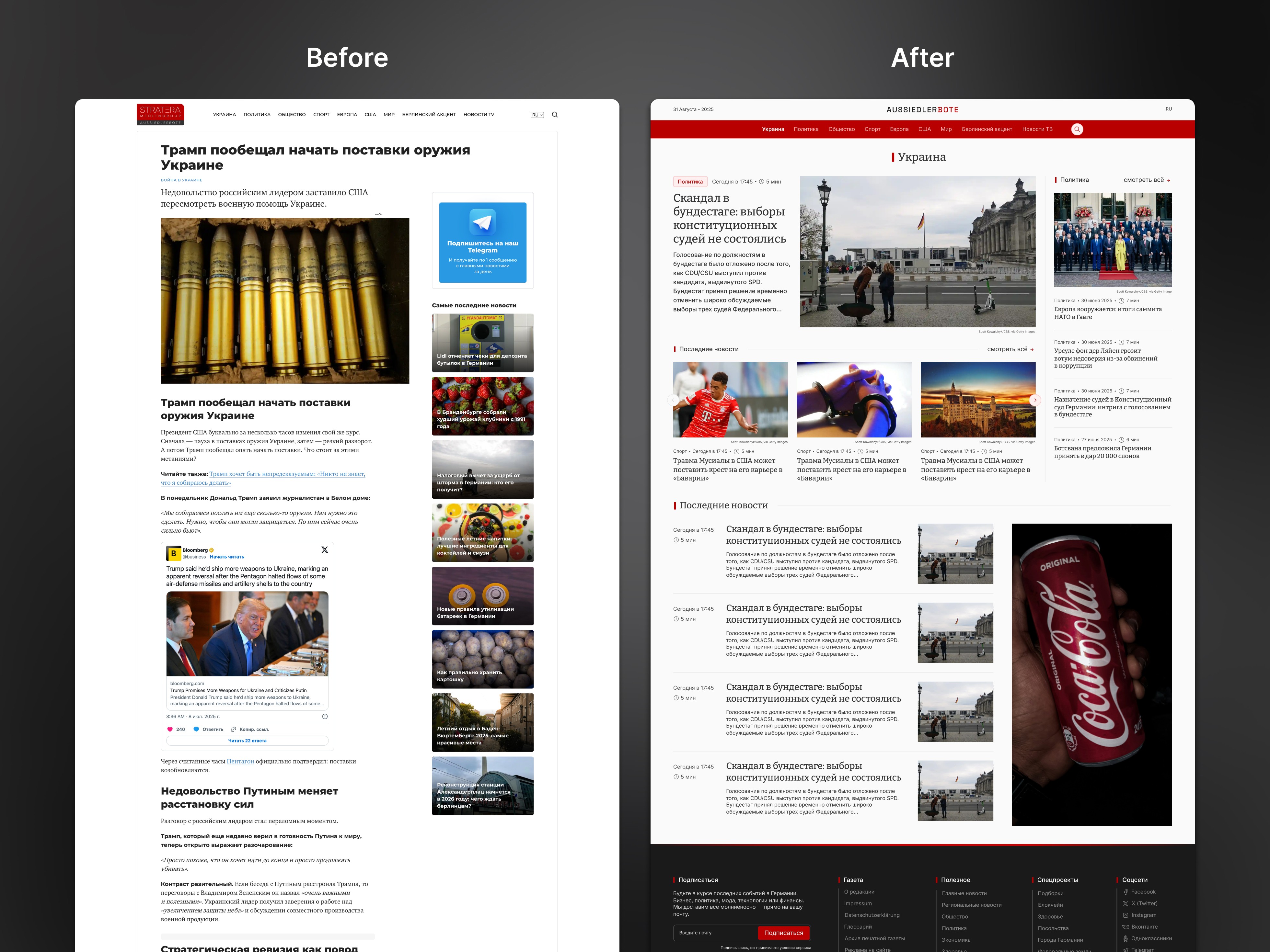 AussiedlerBote is a digital news platform covering German politics, immigration, and social issues. I was responsible for a full redesign of the website, from homepage and article layout to typography, spacing, and ad placements.